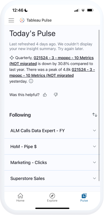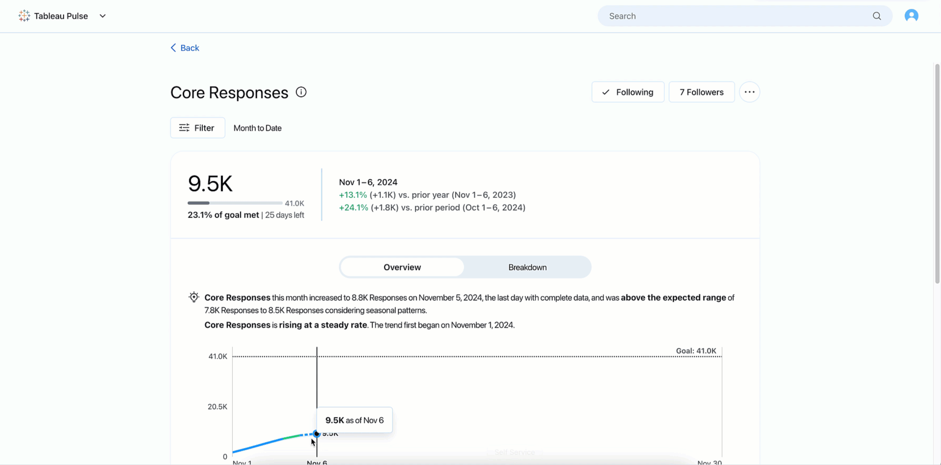 Tableau Pulse helps you discover metrics more easily by exposing metric follower count in the insight exploration page and metric search. *Released August 2024