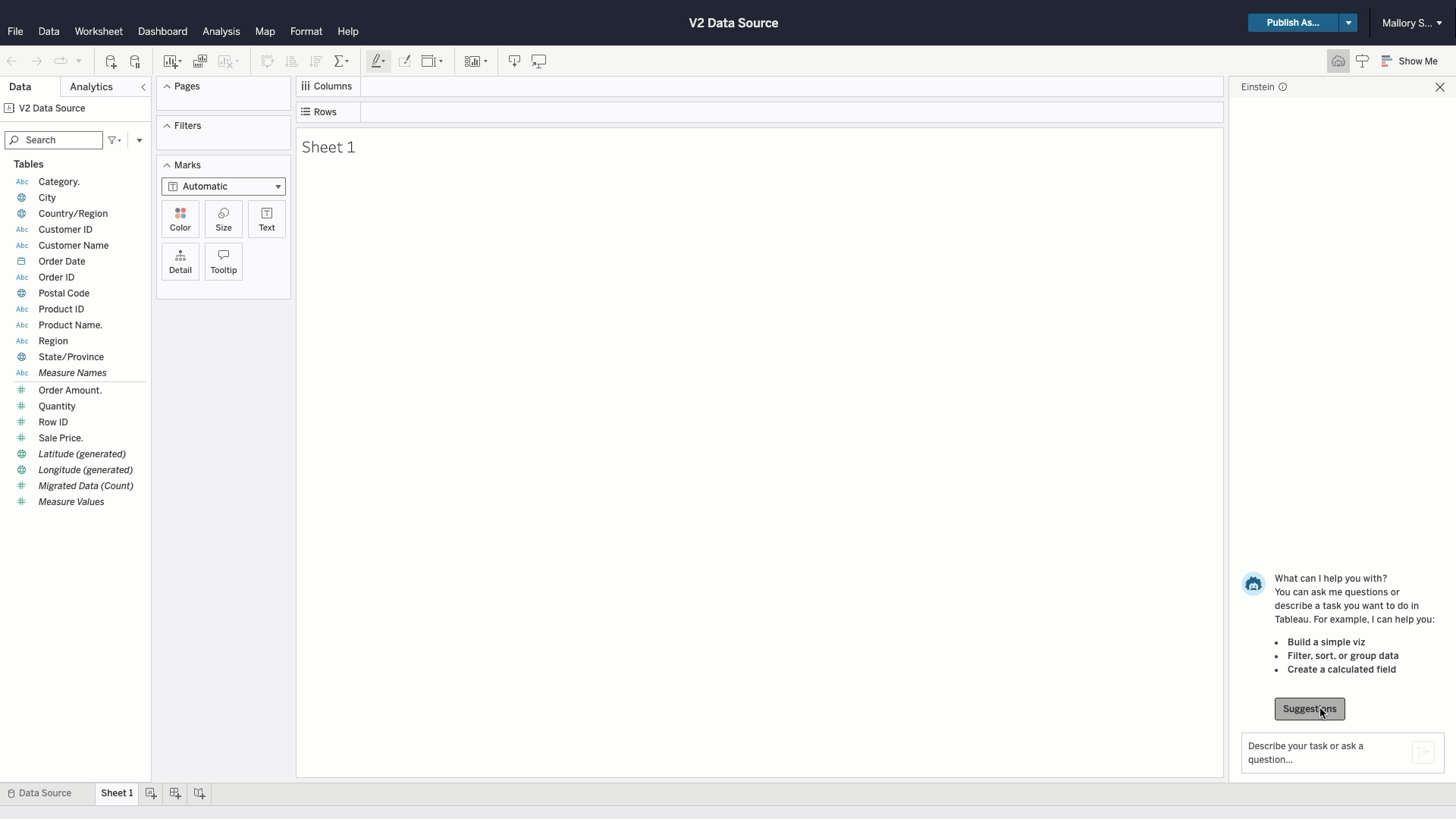 Simplify the analytics process with the help of a trusted AI assistant. Transform natural language prompts into visualizations, formulate calculations to enhance your analysis, and get suggested questions based on your data. Tableau Agent will work with you, so you can move freely between manual drag and drop actions and formula editing to communicating requests with your agent.