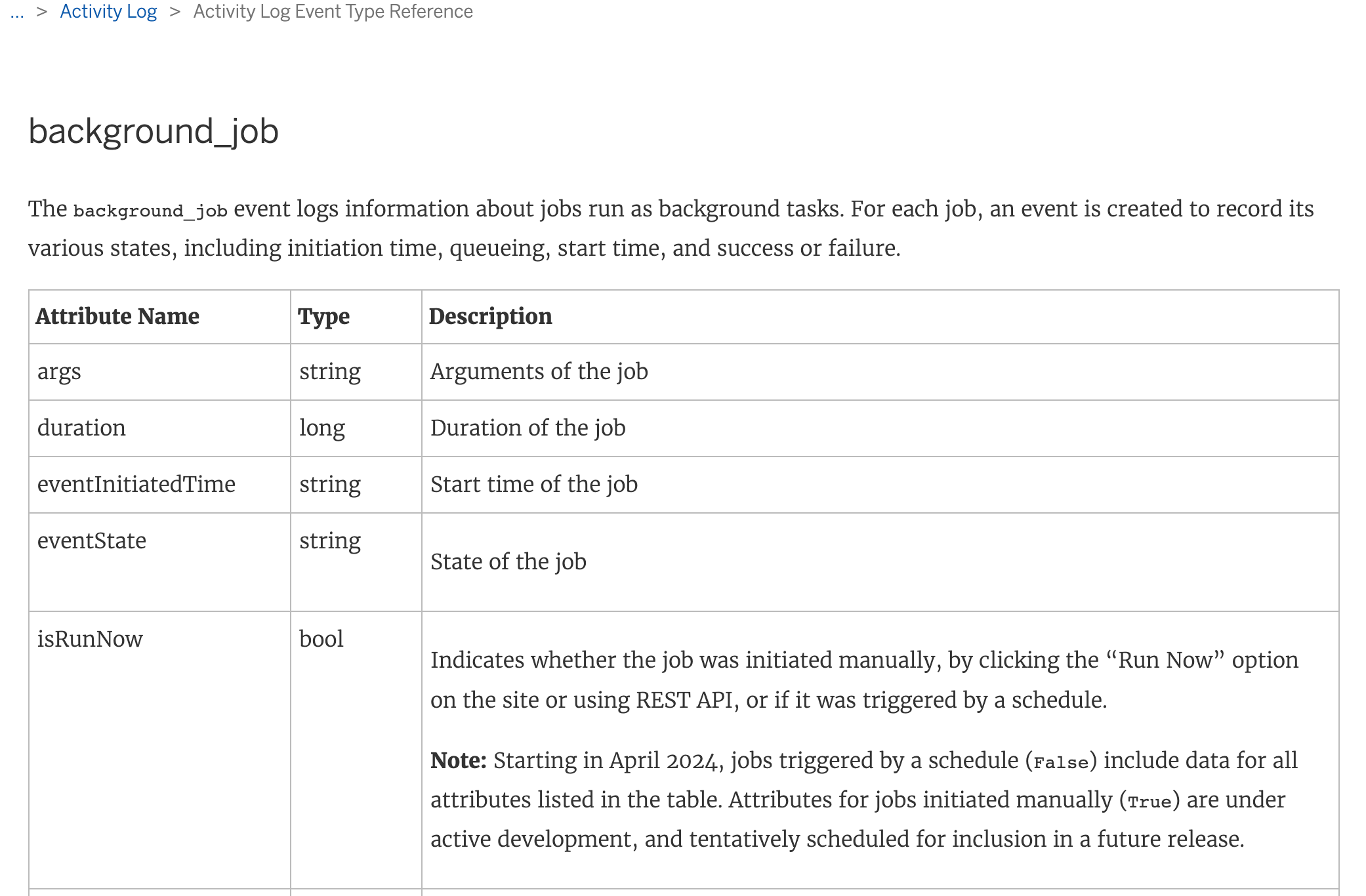 Monitor extract refreshes in real time to meet data freshness requirements. Ensure data is up-to-date and quickly troubleshoot problems with the background_job event type.