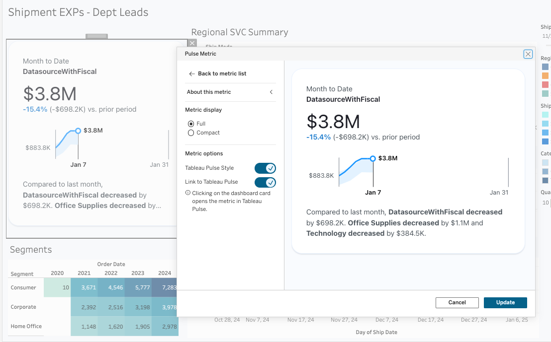 Tableau dashboard creators can now embed Pulse metrics using a built-in dashboard object available in both Desktop and Server dashboard authoring. By embedding Pulse metrics in operational, strategic, and performance dashboards, users can click on a metric to navigate to its detail page, where they can delve deeper into metric trends and readable insights. *Released August 2024