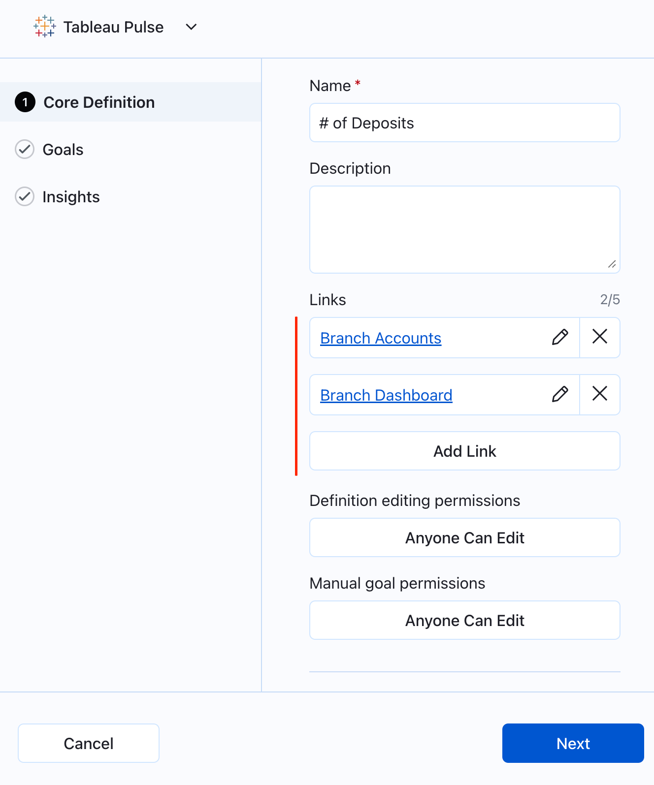 Access content relevant to your analysis easily by linking related content to metrics. You can now add up to five links in the core definition step, which will be presented on the insight exploration page and related metrics page.