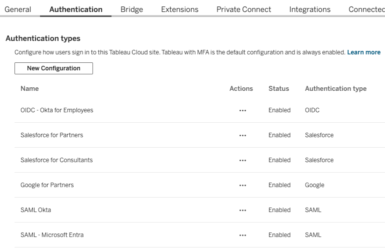 Enable up to 20 identity providers on a single Tableau Cloud site. Use multiple identity providers to allow external users, internal users, and partners secure access to your Tableau Cloud site.