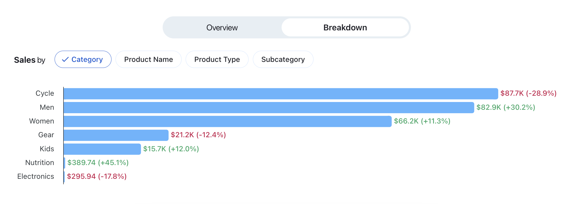 Identify what is driving your business with period-over-period changes of dimensions in the breakdown chart on the metric detail page. Pulse now shows you the percent change of dimension values next to the overall value within your breakdown chart.