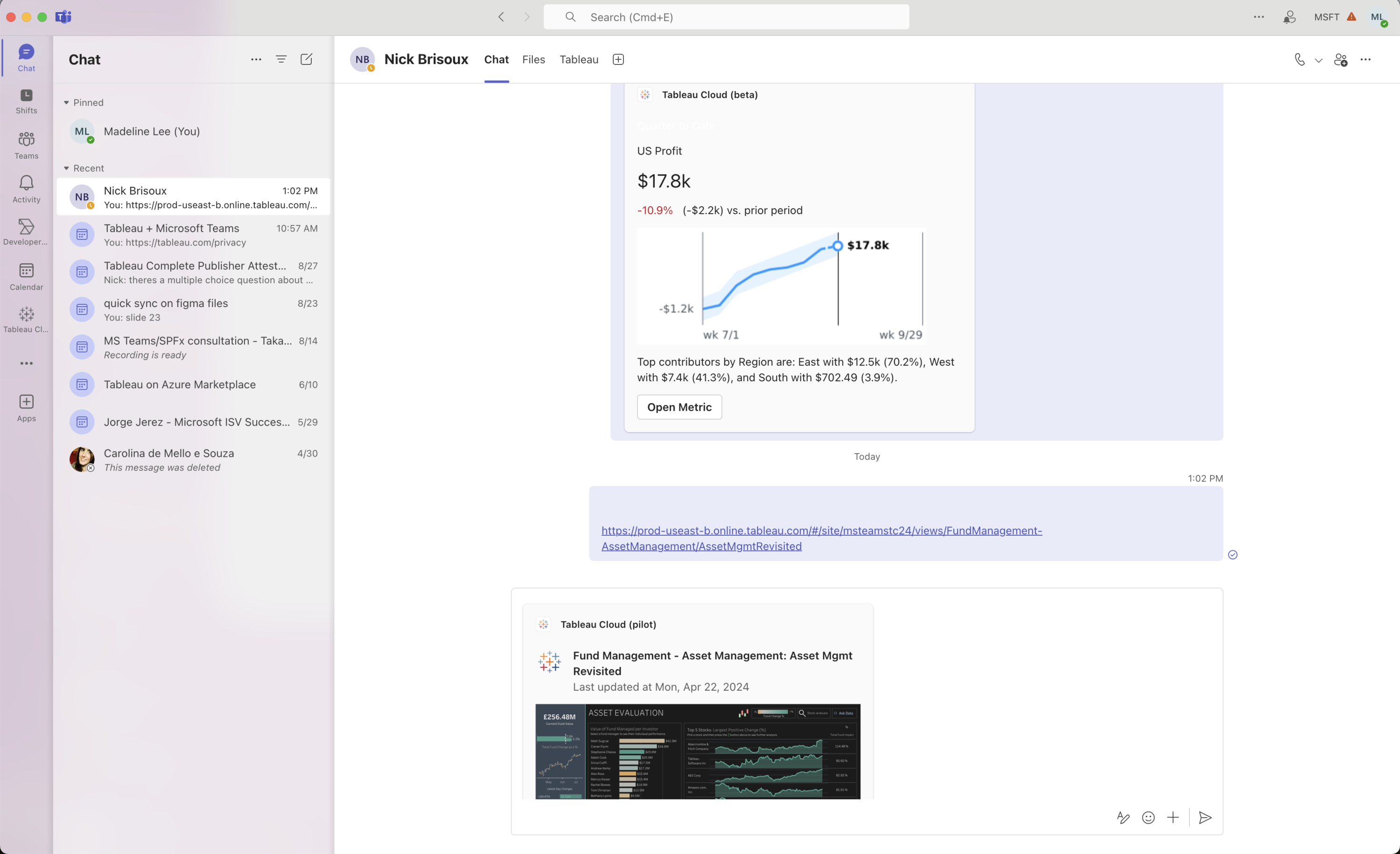 With the new Tableau Cloud App for Microsoft Teams, users can effortlessly incorporate data-driven insights into their daily workflows, leading to faster, more efficient decision-making. This integration enables real-time data sharing, allowing users to easily share Tableau visualizations, dashboards, and Pulse Metrics directly within Teams chats and meetings. This promotes a more data-driven culture by ensuring everyone can work together more effectively with access to the same data and analytics within their workflow.