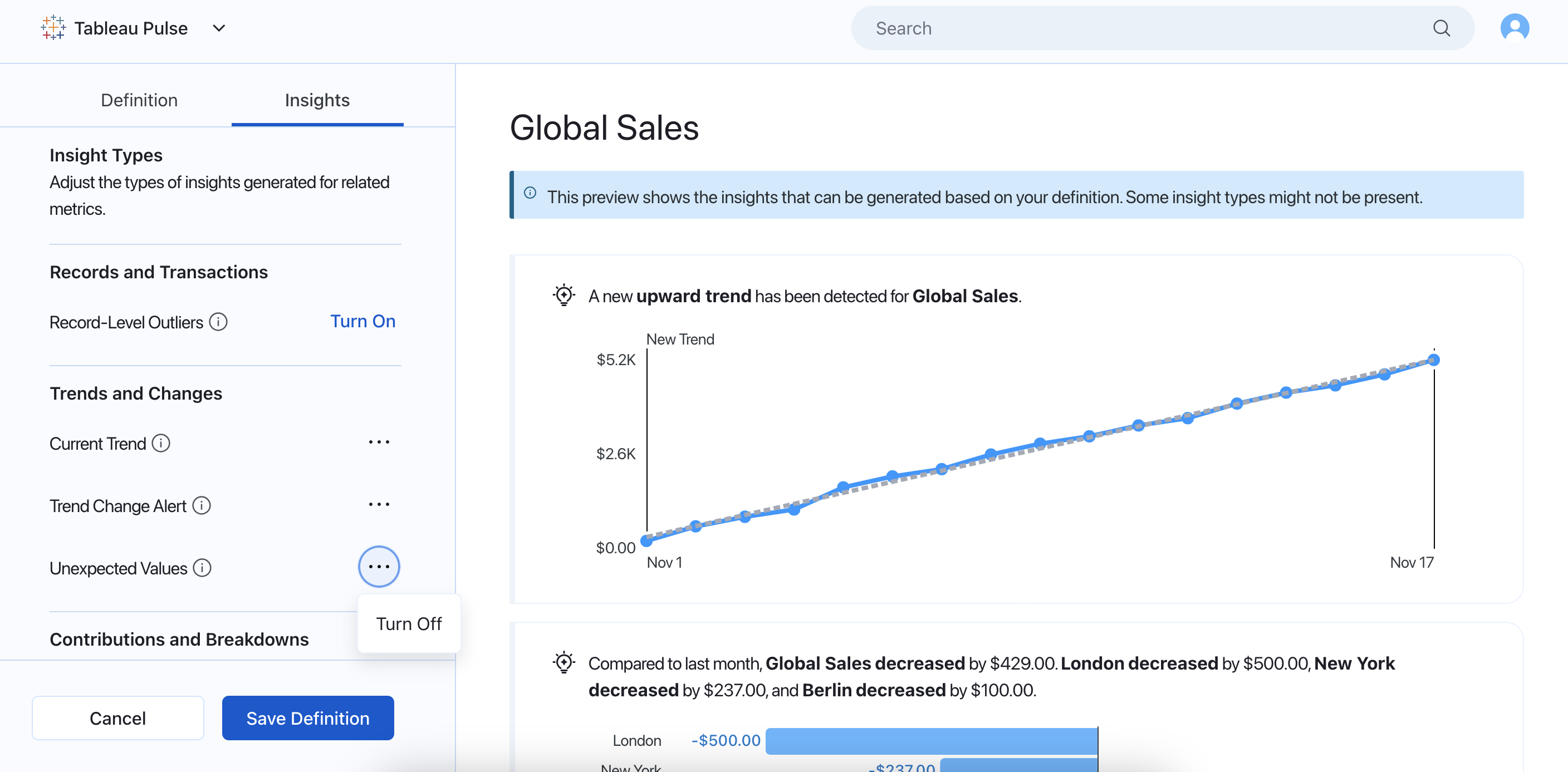 Tableau Pulse now more accurately reflects the expected range of metrics and recognizes unusual changes for data with seasonality trends. *Released August 2024