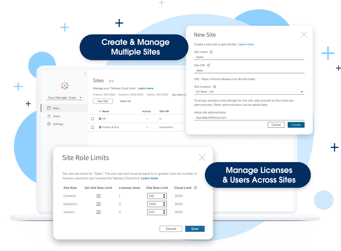Tableau Cloud Manager allows admins to create and manage multiple Tableau sites in the regions of their choice. Admins can manage licenses and users across sites without having to license a single user multiple times. This simplifies the expansion and management of their cloud analytics environment while helping ensure they meet data residency requirements and maintain governance.