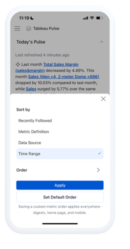 The ability to sort and arrange your metrics to organize and evaluate related metrics together is available on the Tableau Mobile app. You can group your metrics from your phone based on the metric name, the data source, and when you start following them. Set the default view to be consistent across your email digests, web view, and the Tableau Mobile app.