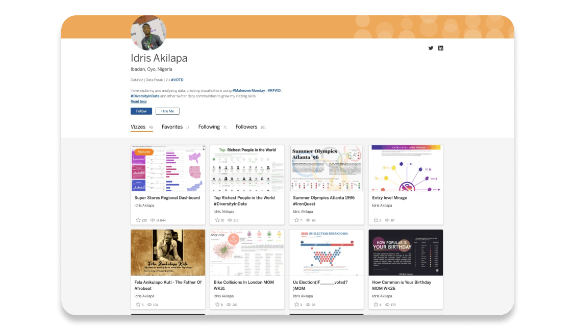 The greatest thing about Tableau Public is that you have a visual portfolio of your work…I landed my dream job after working with Tableau Public for less than six months. It has truly changed my life and the lives of hundreds of others.